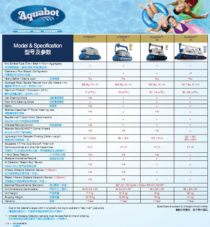 Aquabot經(jīng)過三十年的不斷創(chuàng)新,在今天成為游泳池市場(chǎng)中的知名經(jīng)典品牌之一;安全可靠的家庭設(shè)計(jì),以滿足任何清潔機(jī)器人住宅游泳池的需求,不論其大小或形狀。